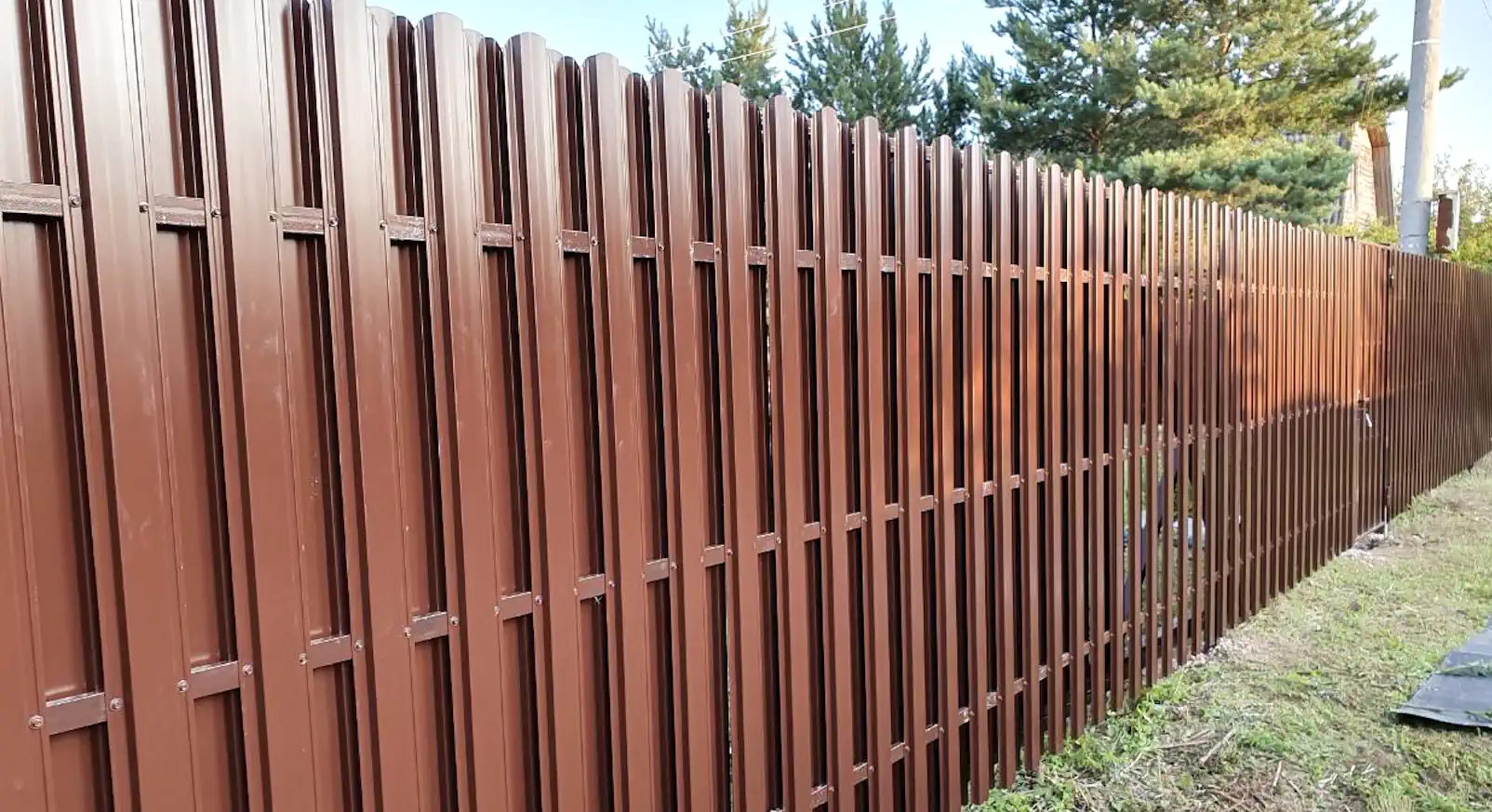 Самый распространённый тип заборов, который используется сейчас, это металлический евроштакетник. Его основные преимущества оптимальное соотношение цена и качество, долговечность, хорошая проветриваемость участка, эстетичность и монтируется просто и легко.